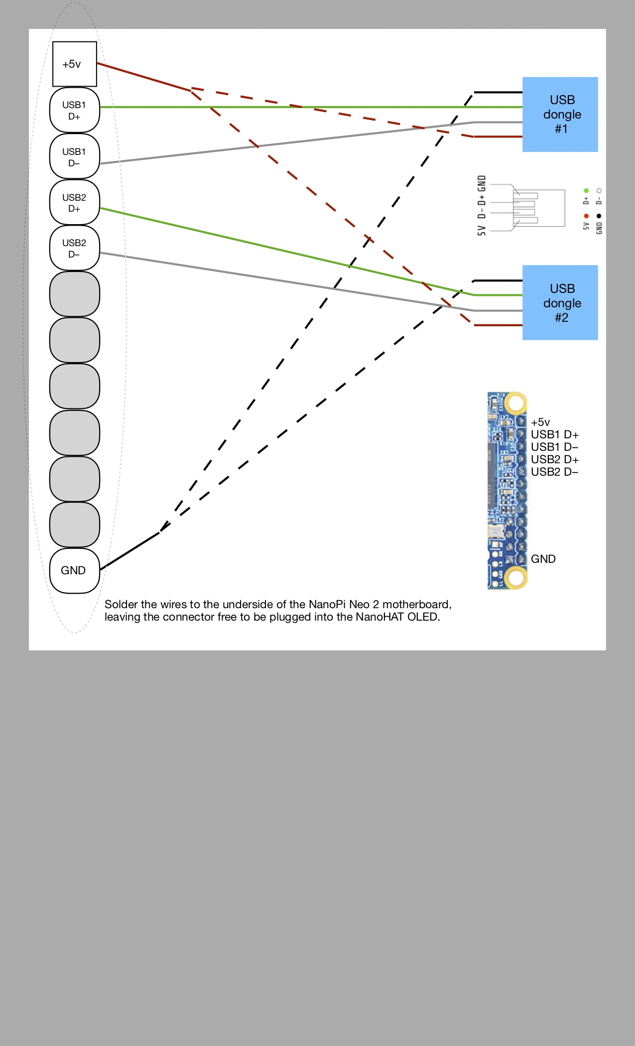 I plan to solder two additional USB devices to the NanoPi Neo2 board via the underside of the unused USB port pins (1-5 on the single-row pins?). This will work if those pins aren’t being useful by the NanoHat OLED, which will be connected to the board by the two sets of pins (single-row and double-row).