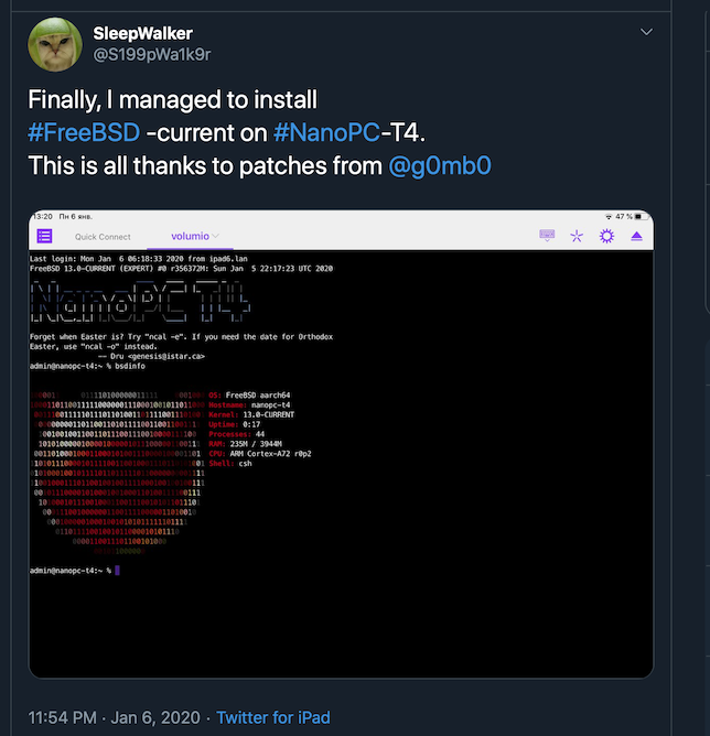 I case you don't follow the news on twitter, FreeBSD developer ganbold@ has successfully running FreeBSD on NanoPC-T4 board