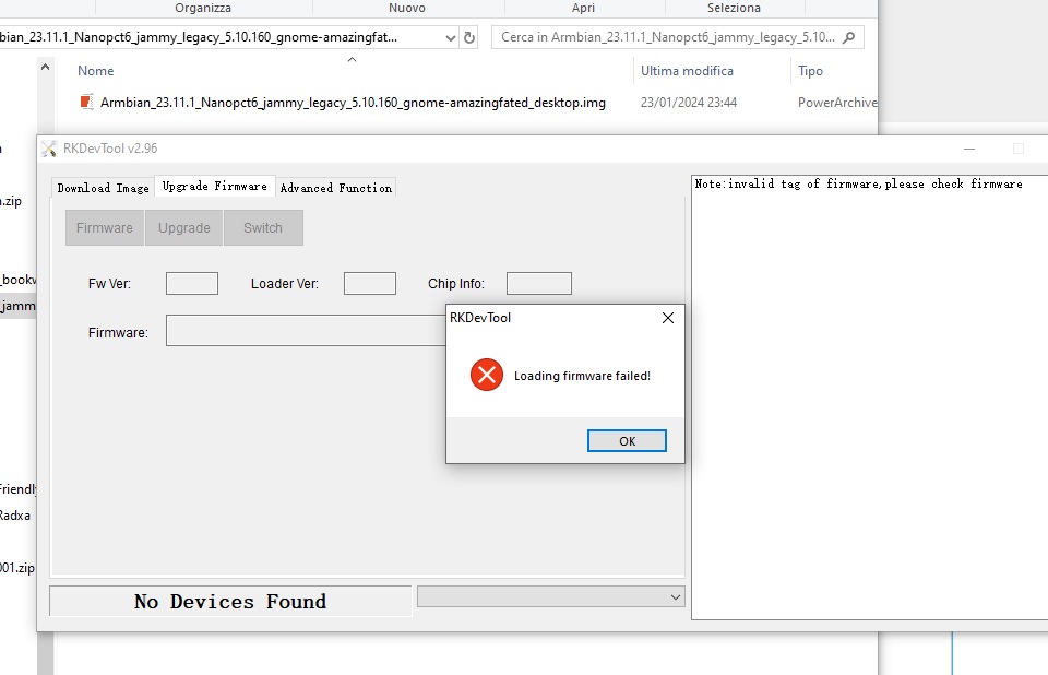 I'm accustomed with the RKdevtool, particularly with the fist tab, but it seems the .img I provide in the second tab "upgrade firmware" is not accepted.