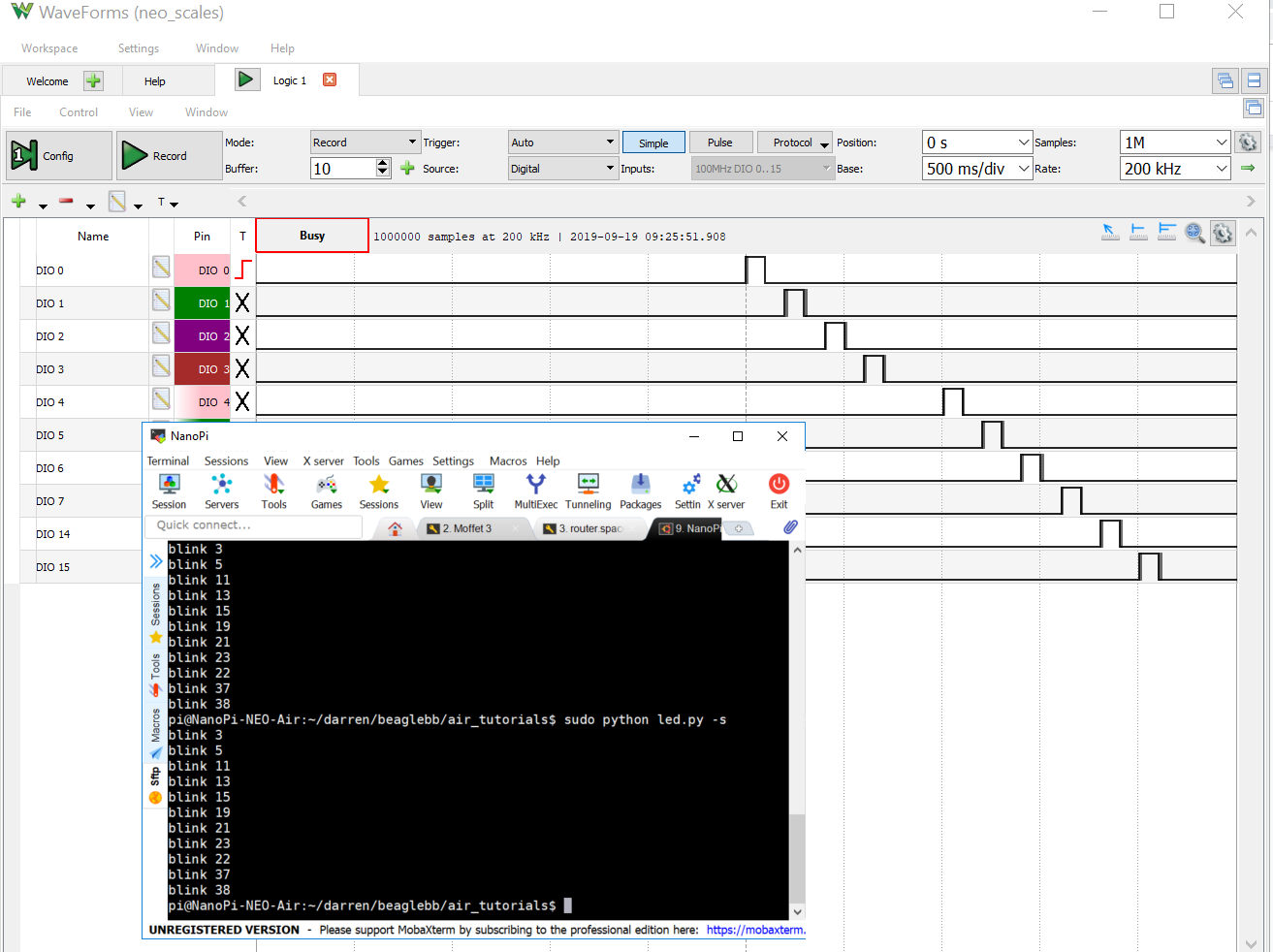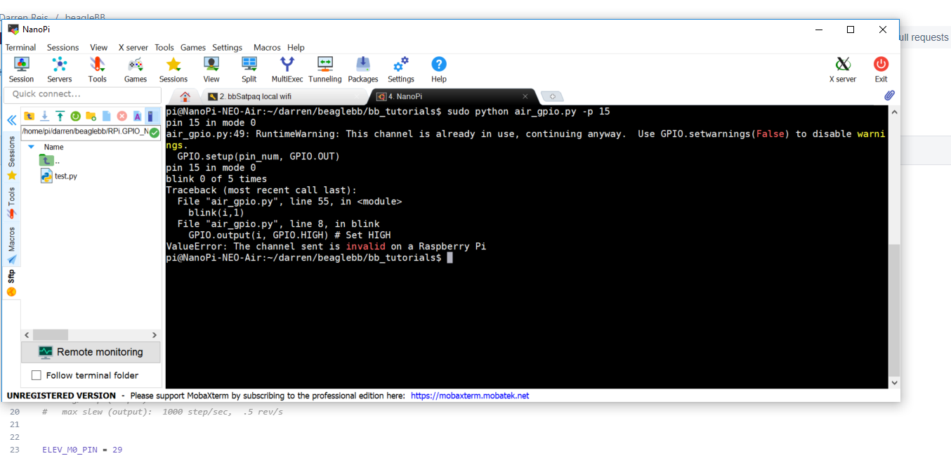 look at the source here https://github.com/friendlyarm/WiringNP/blob/master/wiringPi/wiringPi.c#L508. When I run on my NEO AIR and look at the characteristics of the headers, consider the usb/audio header (pic attached). all except 1 of the pins on this header have no mode, and do not work. So when I run the demo "led.py" assigned to pin 32, which should be an i2c pin, one that I need for my project, python spits a value error that the channel is invalid for RPi. Fine. Then when I run assigned to phys pin 31, i same thing. This made me think it is an "off" problem. But when I run the script assigned to physical pin 16, also an 'off' pin, it works. This doesn't make sense. What am i doing wrong? I need help getting IO access to all of the pins, even ones that are not RPi standard ones.